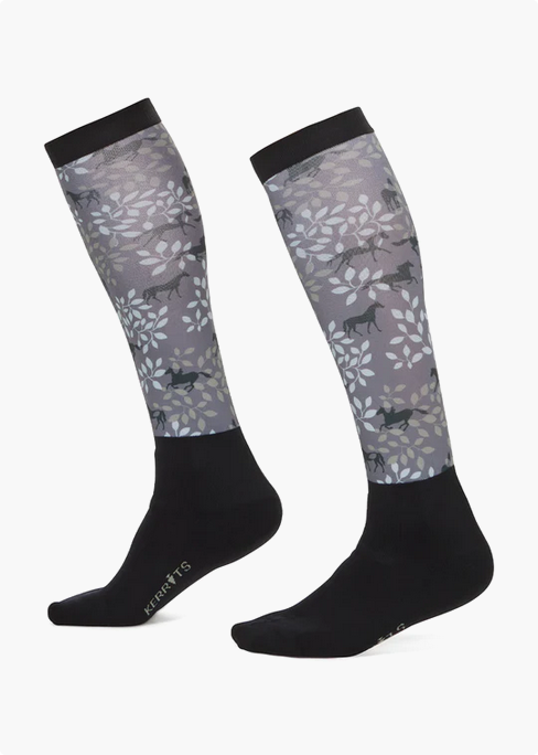 A staple equestrian tall boot socks with two technical fabrics for area specific functionality. Breathable and wicking, the lightweight microfiber fabric calf slides effortlessly into a tall boot and features exclusive equestrian prints for a touch of style and fun. A cotton-blend, cushioned foot bed with arch support keeps feet comfortable, protecting them from interior boot edges.
